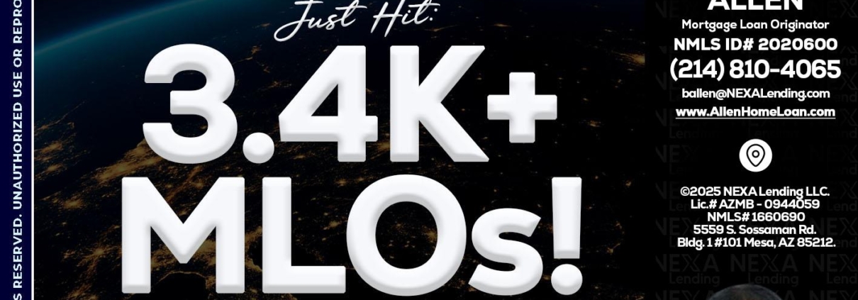 3.4K MLOs - Barbara Allen -Mortgage ConsultantHi, my name is Barbara Allen. I’m a Loan Officer with Allen Home Loan empowered by NEXA Mortgage LLC., offering personalized mortgage solutions, fast customized quotes, great rates and service with integrity.