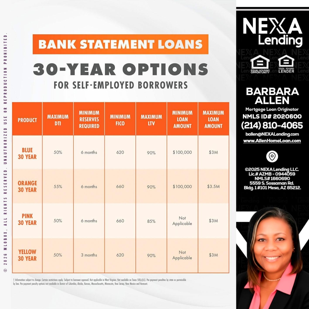 30 YEARS OPTIONS - Barbara Allen -Mortgage ConsultantHi, my name is Barbara Allen. I’m a Loan Officer with NEXA Lending LLC., offering personalized mortgage solutions, fast customized quotes, great rates and service with integrity.