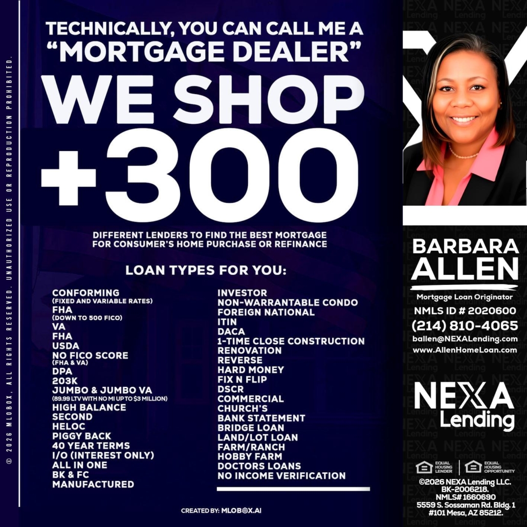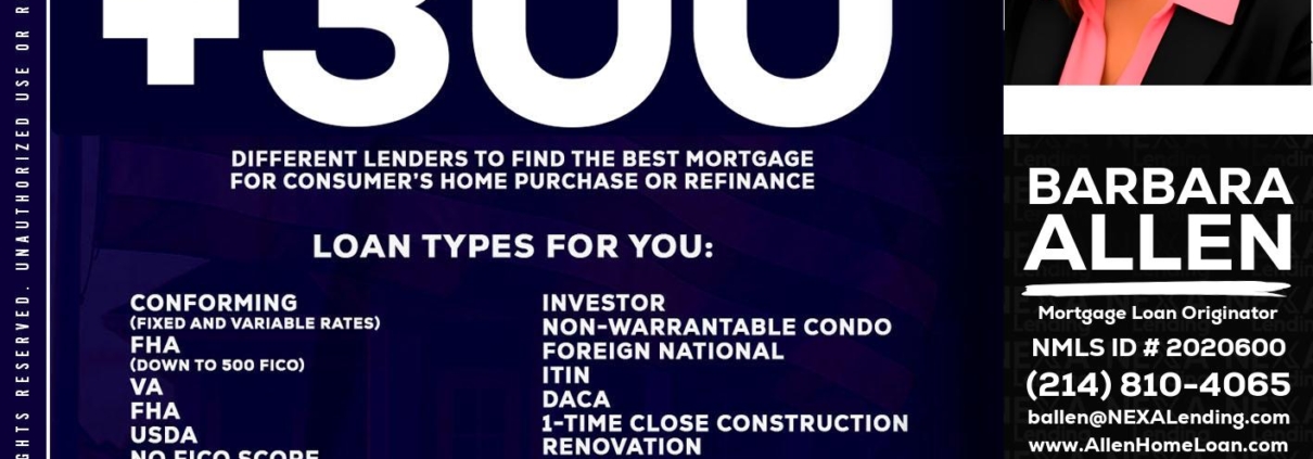 Hi, my name is Barbara Allen. I’m a Loan Officer with NEXA Lending LLC., offering personalized mortgage solutions, fast customized quotes, great rates and service with integrity.