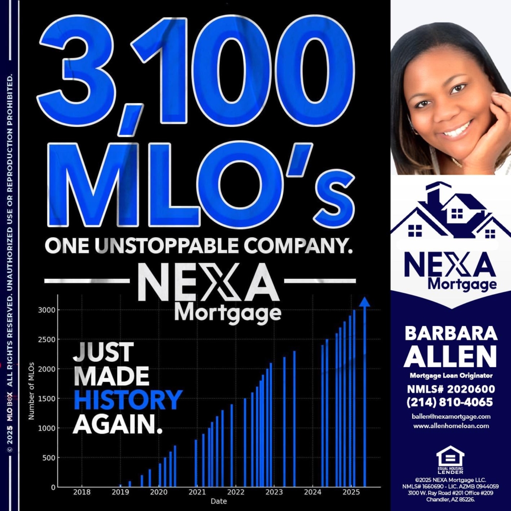 Hi, my name is Barbara Allen. I’m a Loan Officer with Allen Home Loan empowered by NEXA Mortgage LLC., offering personalized mortgage solutions, fast customized quotes, great rates and service with integrity.