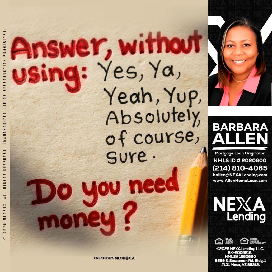 Hi, my name is Barbara Allen. I’m a Loan Officer with NEXA Lending LLC., offering personalized mortgage solutions, fast customized quotes, great rates and service with integrity.