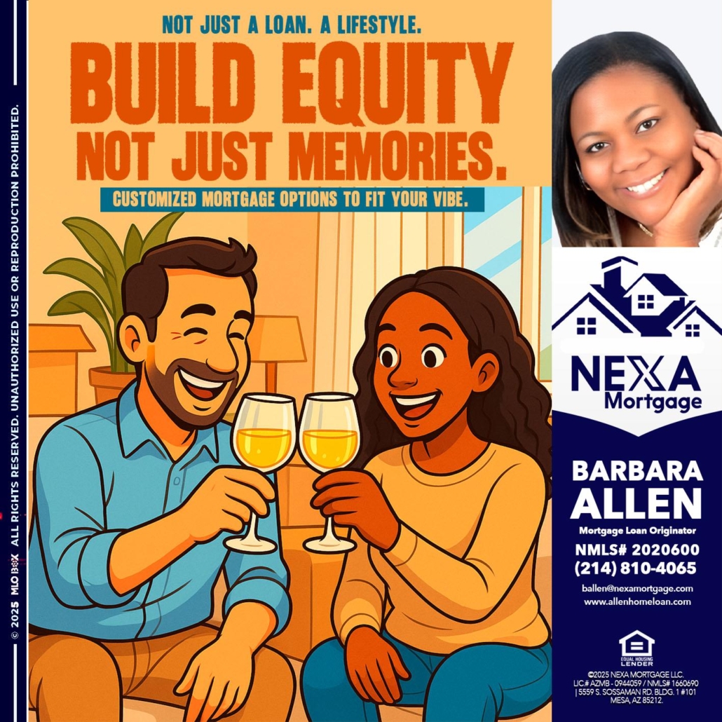 Hi, my name is Barbara Allen. I’m a Loan Officer with Allen Home Loan empowered by NEXA Mortgage LLC., offering personalized mortgage solutions, fast customized quotes, great rates and service with integrity.