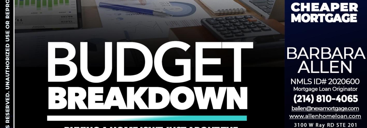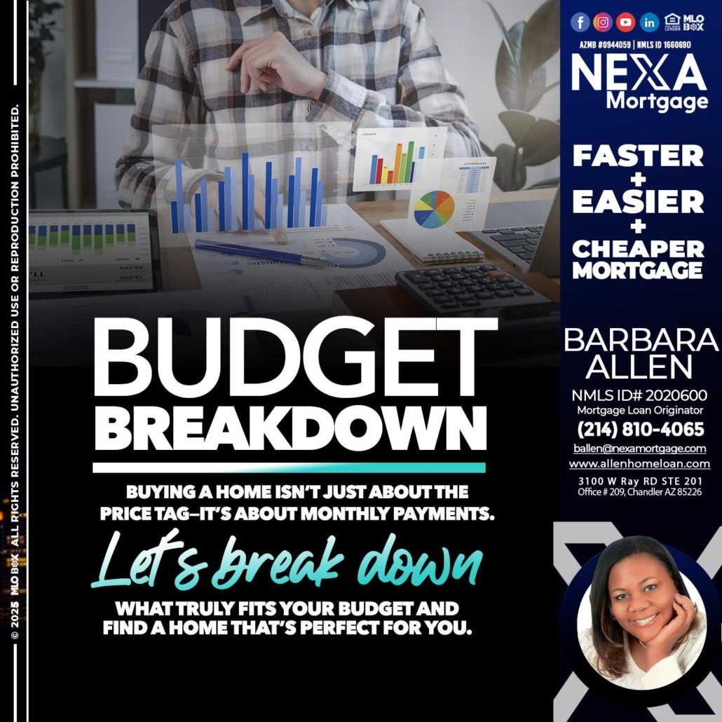 BUDGET BREAKDOWN - Barbara Allen -Mortgage ConsultantHi, my name is Barbara Allen. I’m a Loan Officer with Allen Home Loan empowered by NEXA Mortgage LLC., offering personalized mortgage solutions, fast customized quotes, great rates and service with integrity.