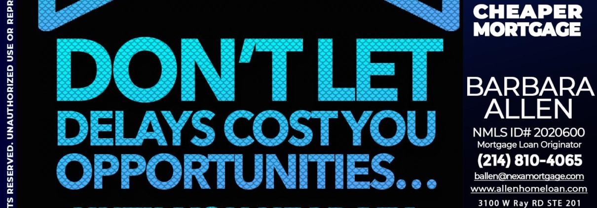 Hi, my name is Barbara Allen. I’m a Loan Officer with Allen Home Loan empowered by NEXA Mortgage LLC., offering personalized mortgage solutions, fast customized quotes, great rates and service with integrity.