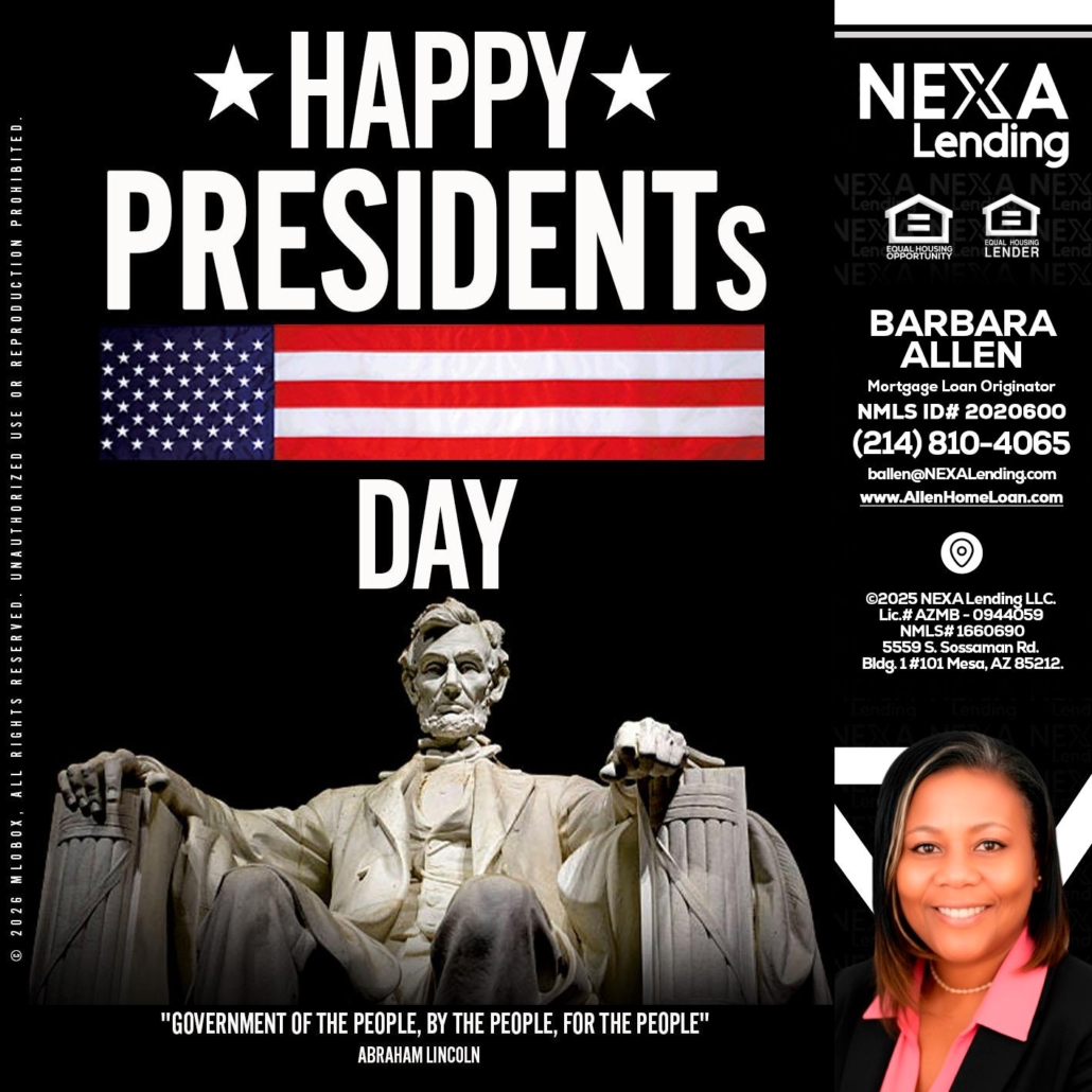 happy presidents day - Barbara Allen -Mortgage ConsultantHi, my name is Barbara Allen. I’m a Loan Officer with NEXA Lending LLC., offering personalized mortgage solutions, fast customized quotes, great rates and service with integrity.