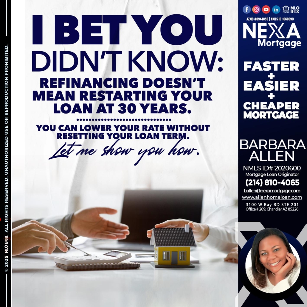 Hi, my name is Barbara Allen. I’m a Loan Officer with Allen Home Loan empowered by NEXA Mortgage LLC., offering personalized mortgage solutions, fast customized quotes, great rates and service with integrity.