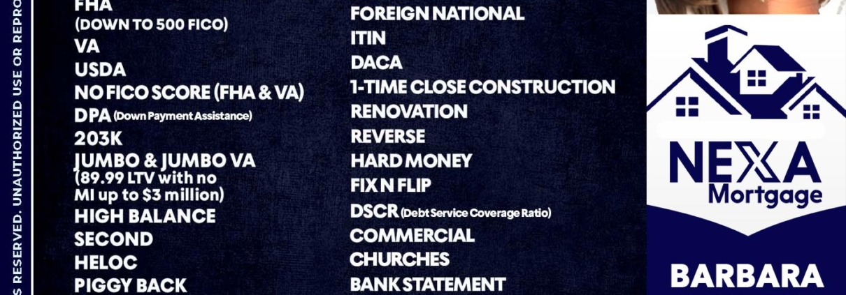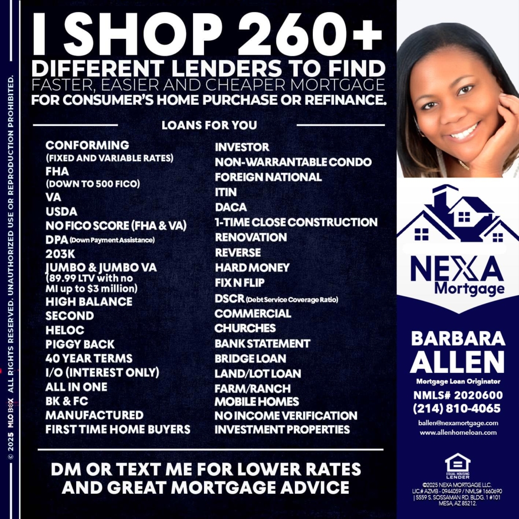 I SHOP +260 - Barbara Allen -Mortgage ConsultantHi, my name is Barbara Allen. I’m a Loan Officer with Allen Home Loan empowered by NEXA Mortgage LLC., offering personalized mortgage solutions, fast customized quotes, great rates and service with integrity.