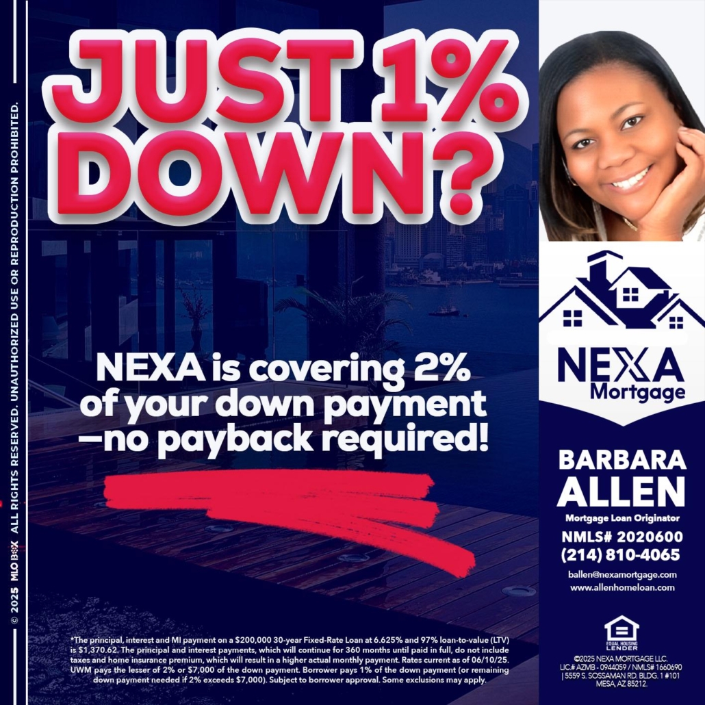 Hi, my name is Barbara Allen. I’m a Loan Officer with Allen Home Loan empowered by NEXA Mortgage LLC., offering personalized mortgage solutions, fast customized quotes, great rates and service with integrity.
