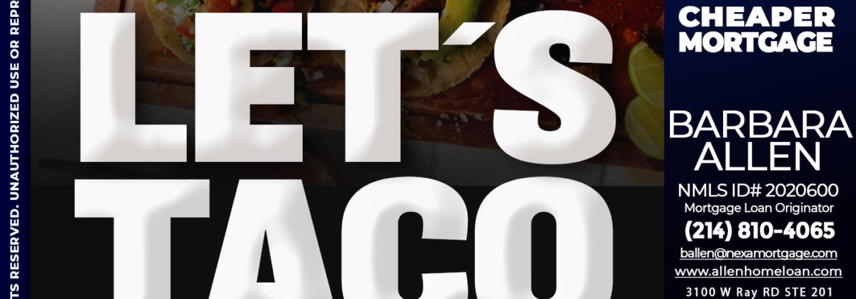LETS TACO - Barbara Allen -Mortgage ConsultantHi, my name is Barbara Allen. I’m a Loan Officer with Allen Home Loan empowered by NEXA Mortgage LLC., offering personalized mortgage solutions, fast customized quotes, great rates and service with integrity.