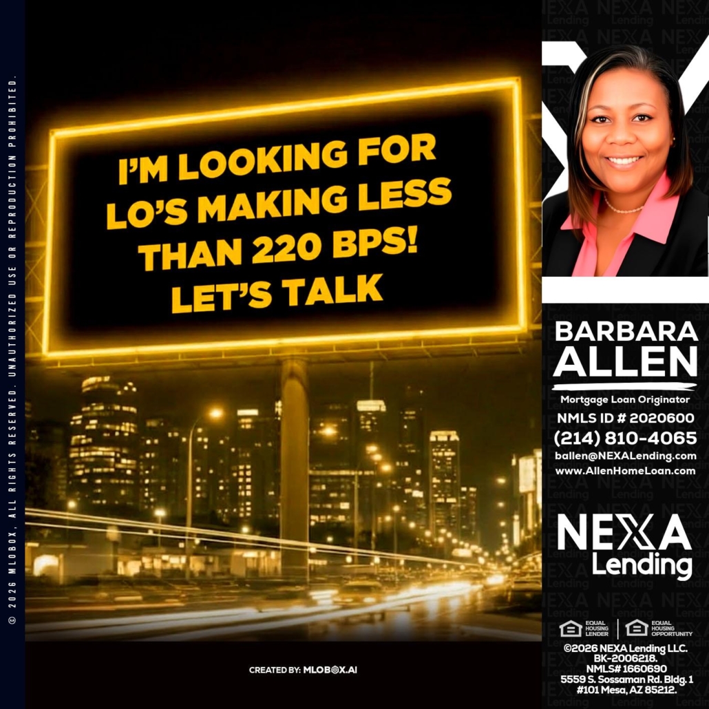 Hi, my name is Barbara Allen. I’m a Loan Officer with NEXA Lending LLC., offering personalized mortgage solutions, fast customized quotes, great rates and service with integrity.