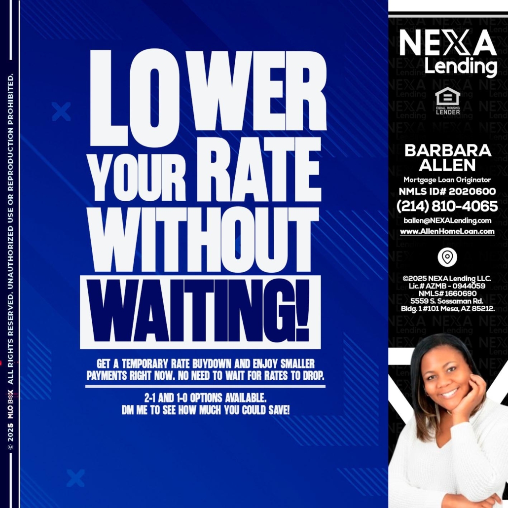 Hi, my name is Barbara Allen. I’m a Loan Officer with Allen Home Loan empowered by NEXA Mortgage LLC., offering personalized mortgage solutions, fast customized quotes, great rates and service with integrity.