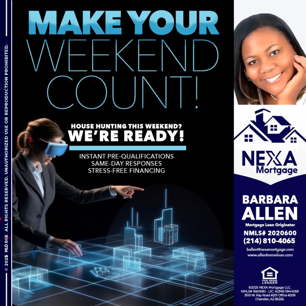 Hi, my name is Barbara Allen. I’m a Loan Officer with Allen Home Loan empowered by NEXA Mortgage LLC., offering personalized mortgage solutions, fast customized quotes, great rates and service with integrity.