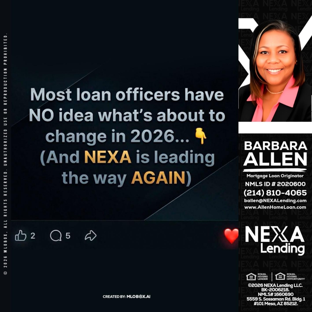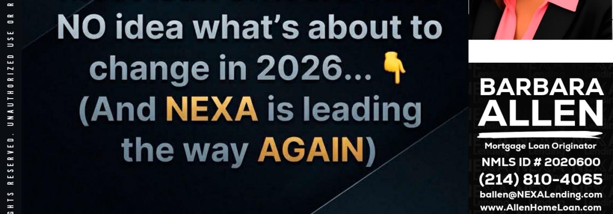Hi, my name is Barbara Allen. I’m a Loan Officer with NEXA Lending LLC., offering personalized mortgage solutions, fast customized quotes, great rates and service with integrity.