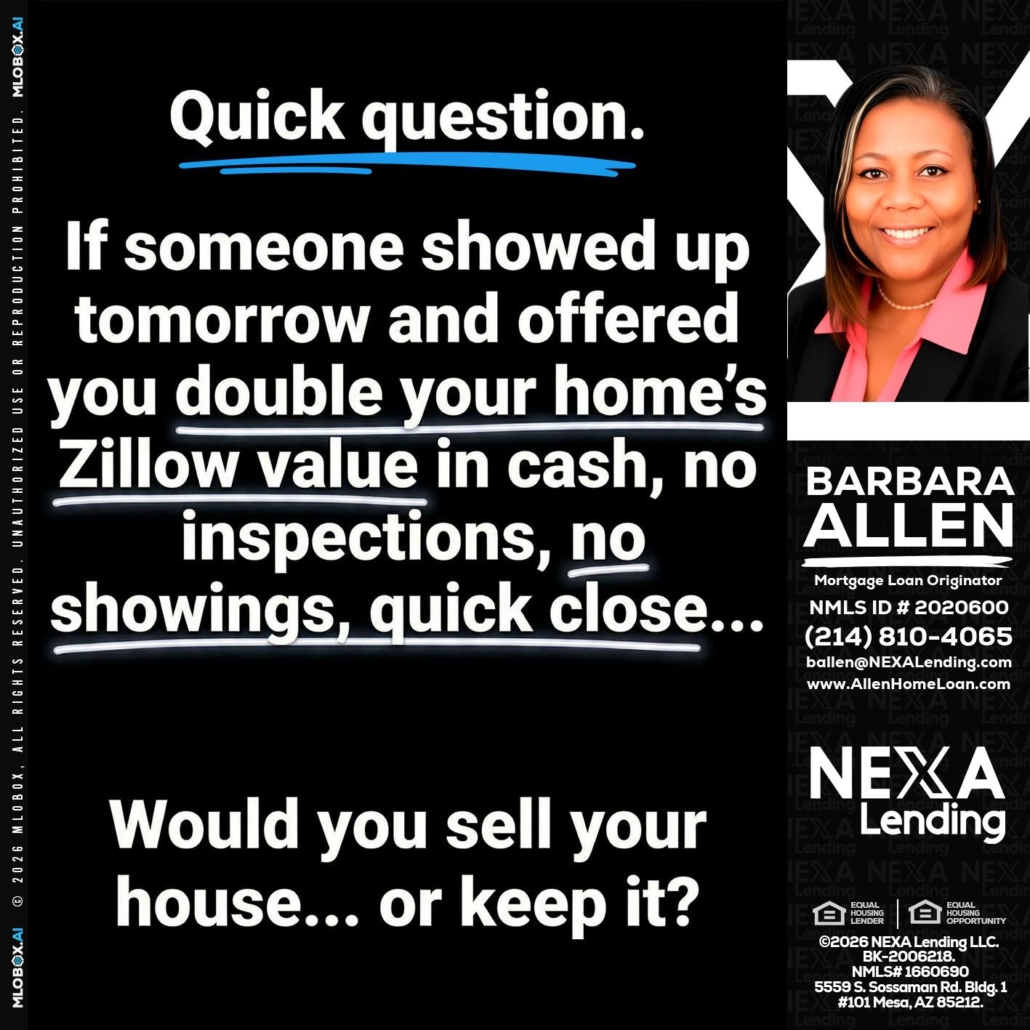 QUICK QUESTION - Barbara Allen -Mortgage ConsultantHi, my name is Barbara Allen. I’m a Loan Officer with NEXA Lending LLC., offering personalized mortgage solutions, fast customized quotes, great rates and service with integrity.