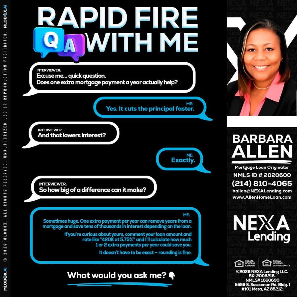 Hi, my name is Barbara Allen. I’m a Loan Officer with NEXA Lending LLC., offering personalized mortgage solutions, fast customized quotes, great rates and service with integrity.