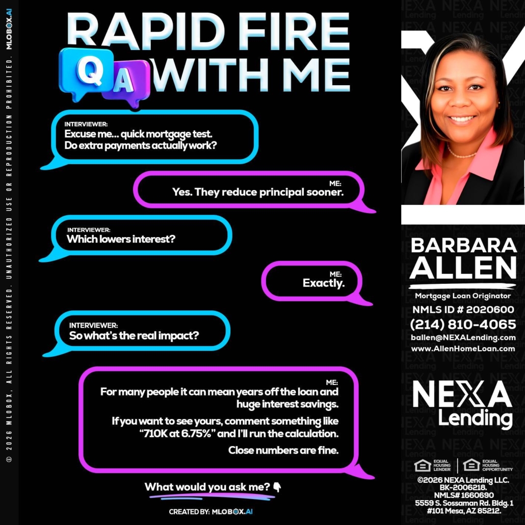 Hi, my name is Barbara Allen. I’m a Loan Officer with NEXA Lending LLC., offering personalized mortgage solutions, fast customized quotes, great rates and service with integrity.
