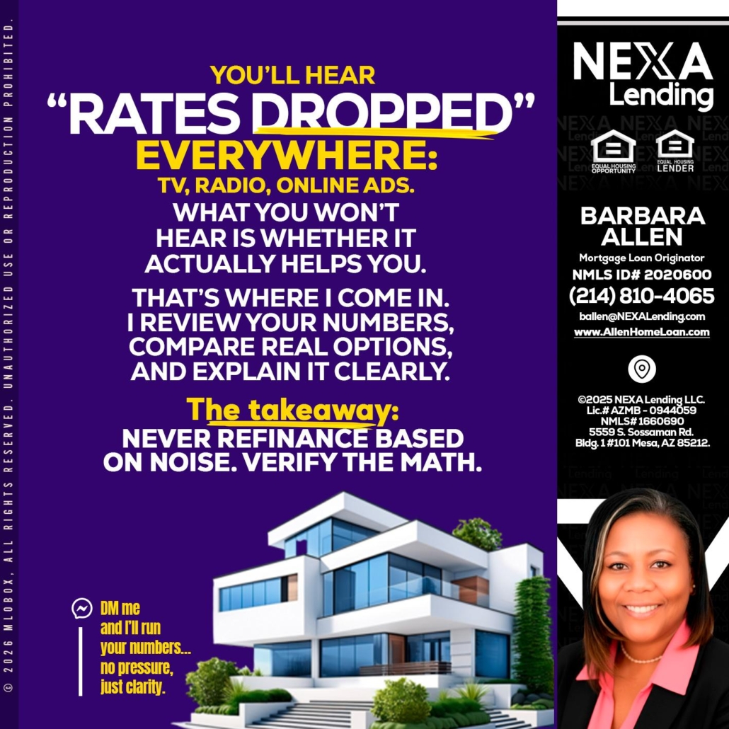 Hi, my name is Barbara Allen. I’m a Loan Officer with NEXA Lending LLC., offering personalized mortgage solutions, fast customized quotes, great rates and service with integrity.