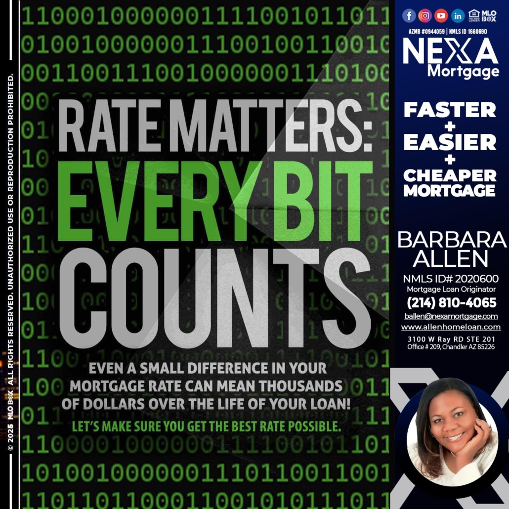 Hi, my name is Barbara Allen. I’m a Loan Officer with Allen Home Loan empowered by NEXA Mortgage LLC., offering personalized mortgage solutions, fast customized quotes, great rates and service with integrity.