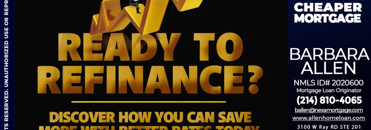 READY TO REFI - Barbara Allen -Mortgage ConsultantHi, my name is Barbara Allen. I’m a Loan Officer with Allen Home Loan empowered by NEXA Mortgage LLC., offering personalized mortgage solutions, fast customized quotes, great rates and service with integrity.