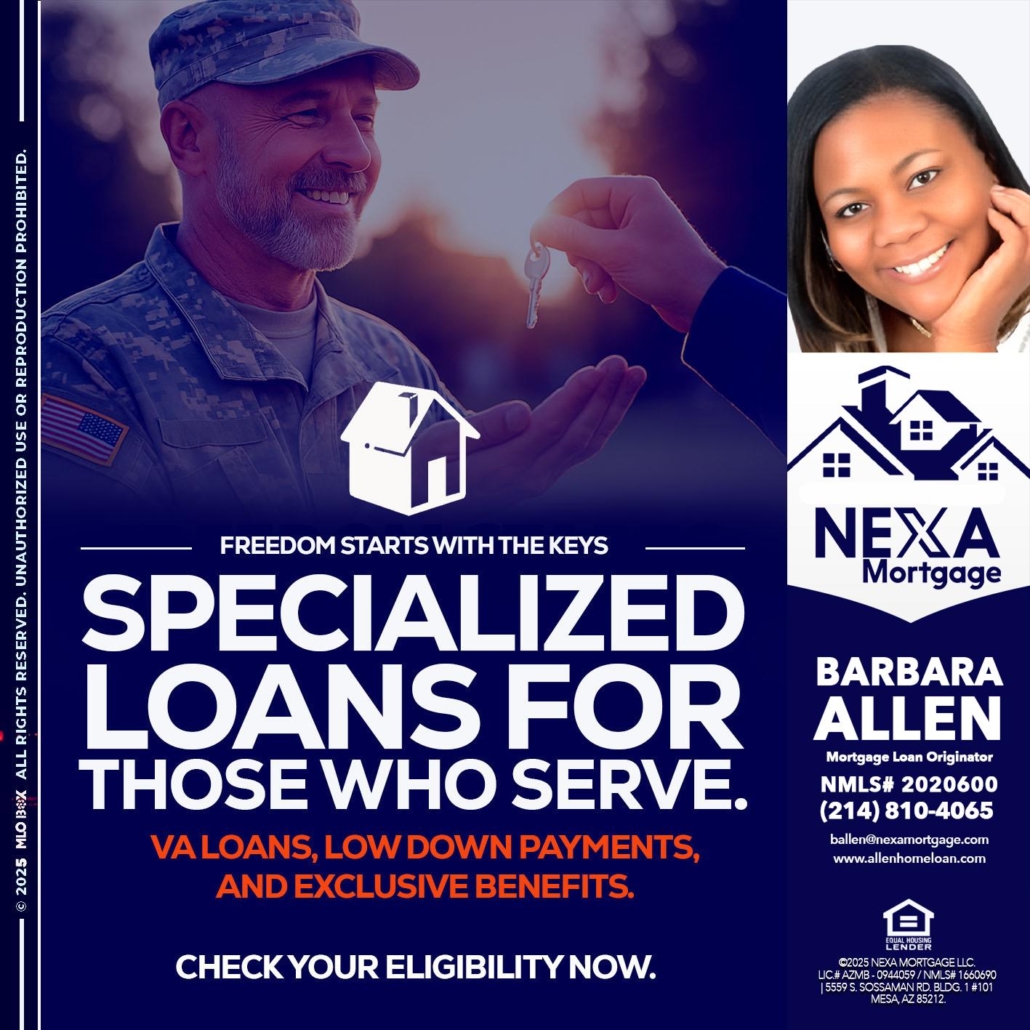 SPECIALIZED LOANS - Barbara Allen -Mortgage ConsultantHi, my name is Barbara Allen. I’m a Loan Officer with Allen Home Loan empowered by NEXA Mortgage LLC., offering personalized mortgage solutions, fast customized quotes, great rates and service with integrity.