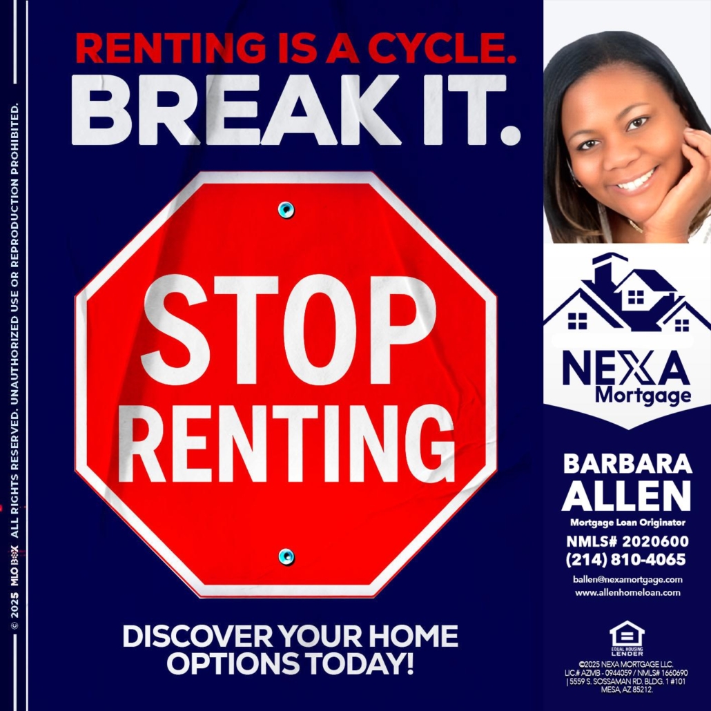 Hi, my name is Barbara Allen. I’m a Loan Officer with Allen Home Loan empowered by NEXA Mortgage LLC., offering personalized mortgage solutions, fast customized quotes, great rates and service with integrity.
