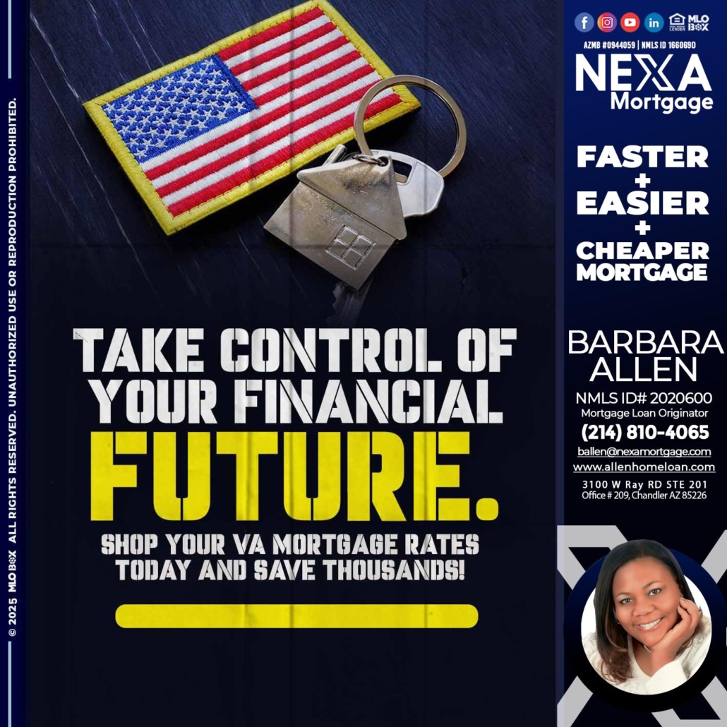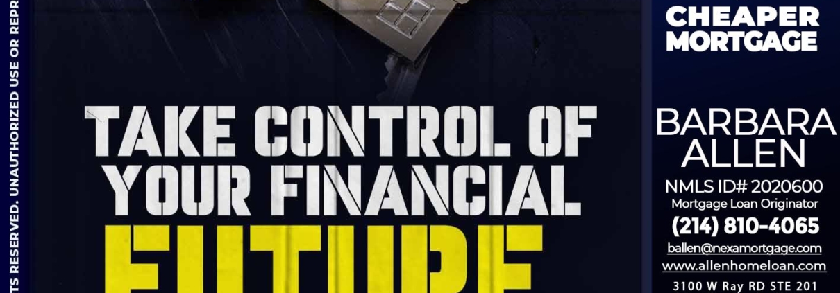 take control - Barbara Allen -Mortgage ConsultantHi, my name is Barbara Allen. I’m a Loan Officer with Allen Home Loan empowered by NEXA Mortgage LLC., offering personalized mortgage solutions, fast customized quotes, great rates and service with integrity.