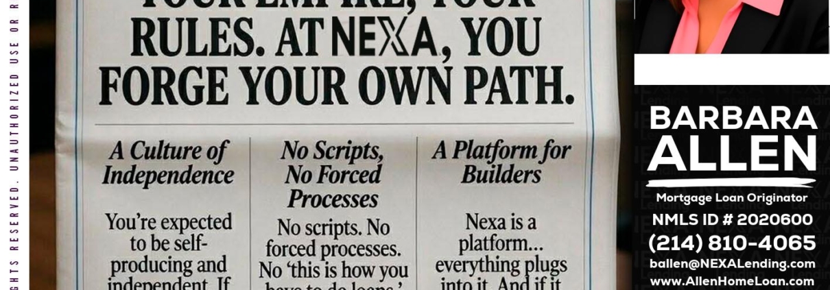 Hi, my name is Barbara Allen. I’m a Loan Officer with NEXA Lending LLC., offering personalized mortgage solutions, fast customized quotes, great rates and service with integrity.