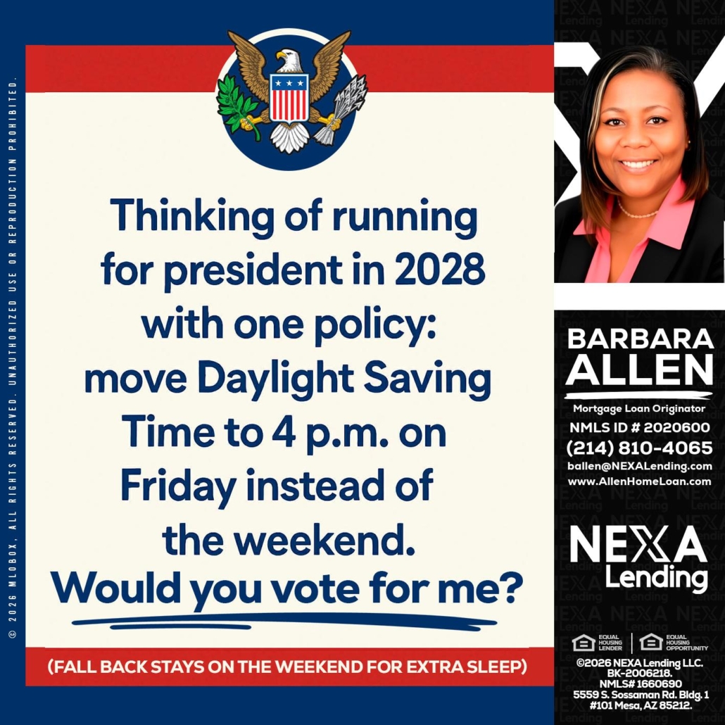 THINKING OF RUNING - Barbara Allen -Mortgage ConsultantHi, my name is Barbara Allen. I’m a Loan Officer with NEXA Lending LLC., offering personalized mortgage solutions, fast customized quotes, great rates and service with integrity.