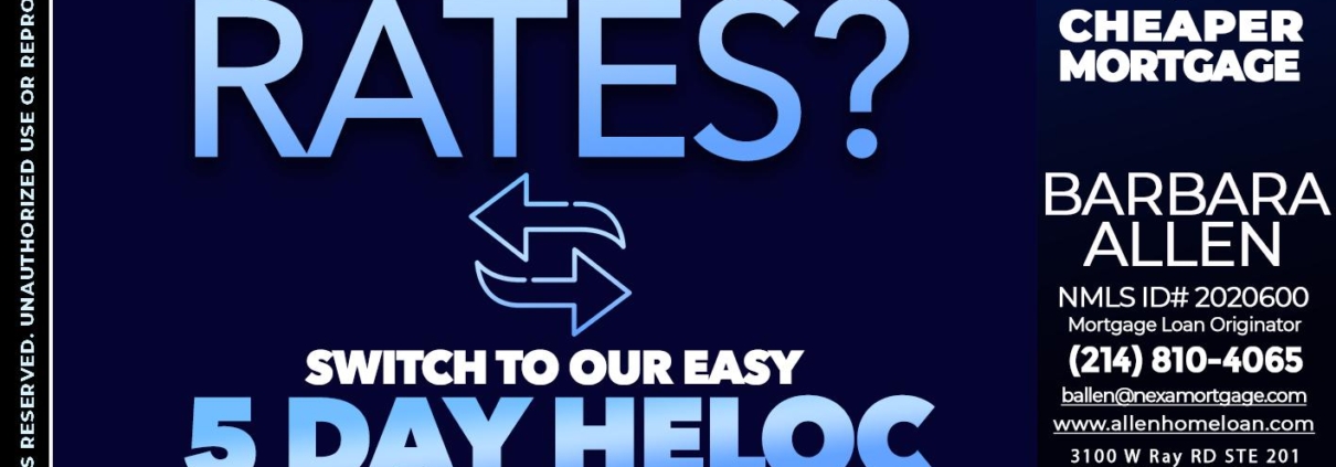 TIRED OF HIGH RATES - Barbara Allen -Mortgage ConsultantHi, my name is Barbara Allen. I’m a Loan Officer with Allen Home Loan empowered by NEXA Mortgage LLC., offering personalized mortgage solutions, fast customized quotes, great rates and service with integrity.