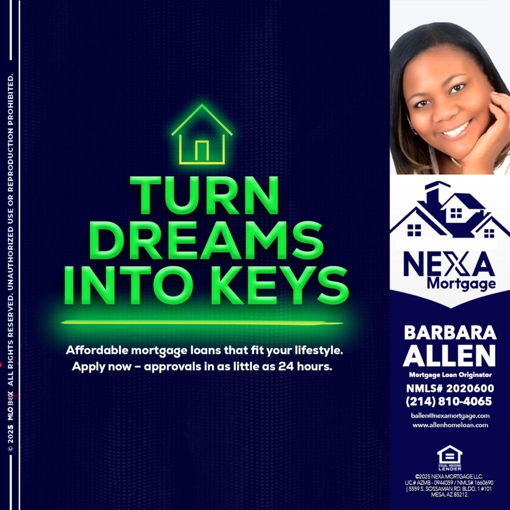 turn dreams - Barbara Allen -Mortgage ConsultantHi, my name is Barbara Allen. I’m a Loan Officer with Allen Home Loan empowered by NEXA Mortgage LLC., offering personalized mortgage solutions, fast customized quotes, great rates and service with integrity.
