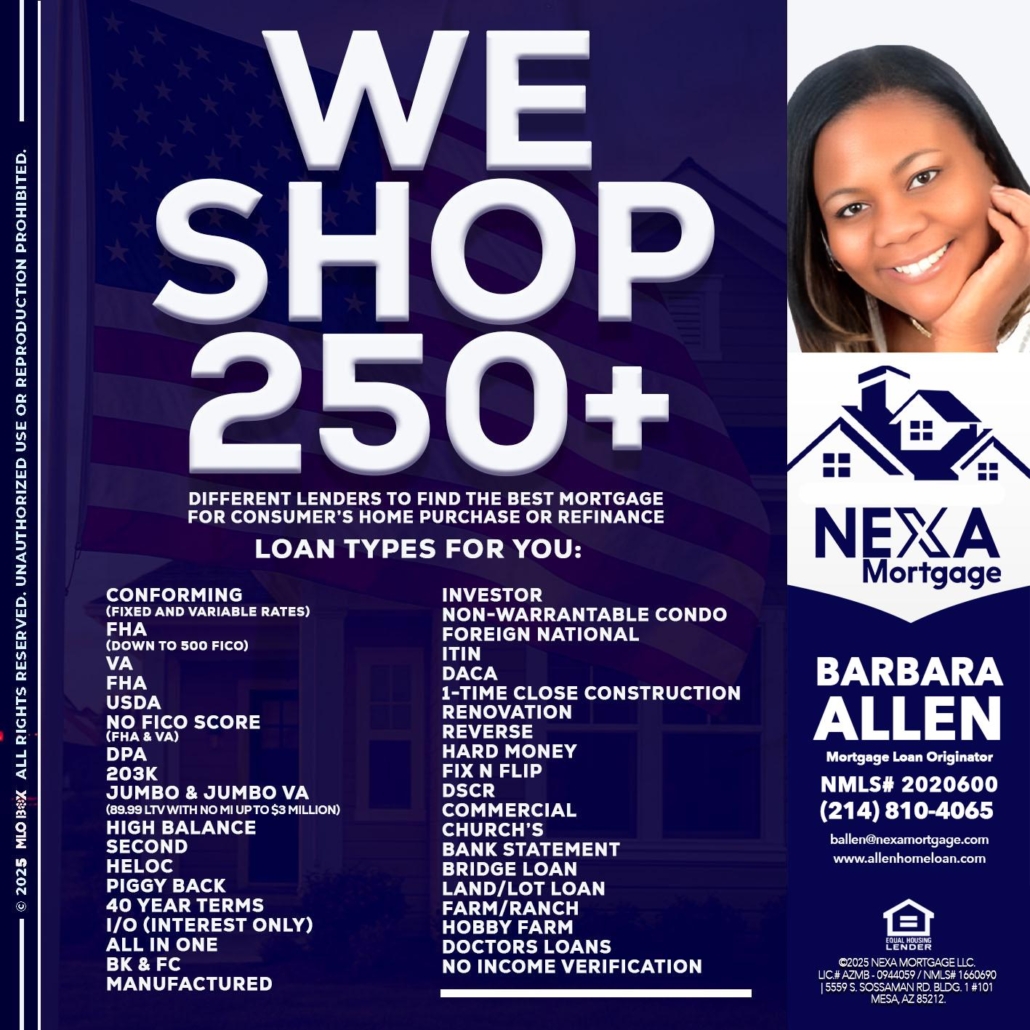 Hi, my name is Barbara Allen. I’m a Loan Officer with Allen Home Loan empowered by NEXA Mortgage LLC., offering personalized mortgage solutions, fast customized quotes, great rates and service with integrity.
