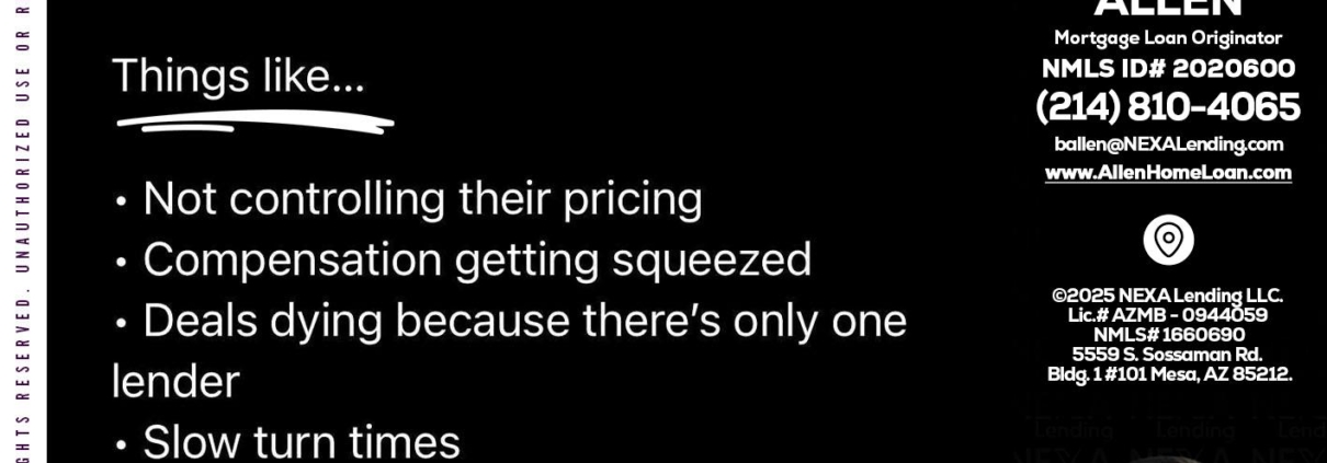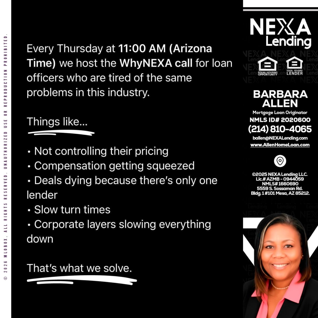 WHY NEXA - Barbara Allen -Mortgage ConsultantHi, my name is Barbara Allen. I’m a Loan Officer with NEXA Lending LLC., offering personalized mortgage solutions, fast customized quotes, great rates and service with integrity.