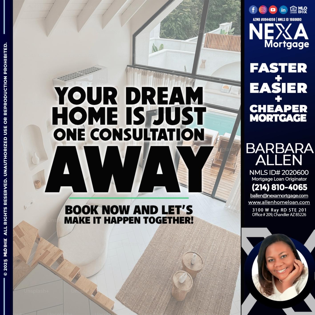 Hi, my name is Barbara Allen. I’m a Loan Officer with Allen Home Loan empowered by NEXA Mortgage LLC., offering personalized mortgage solutions, fast customized quotes, great rates and service with integrity.